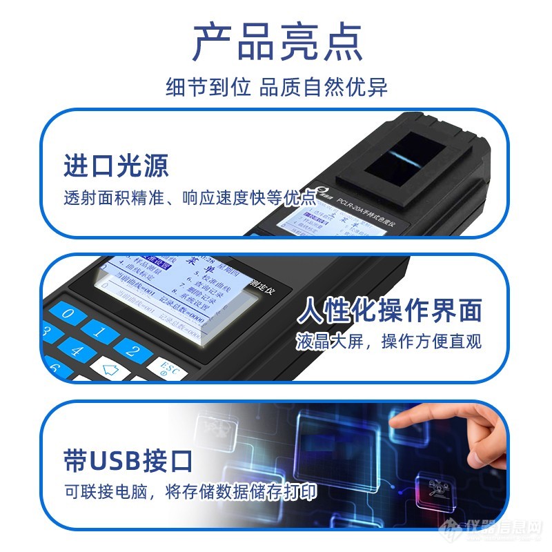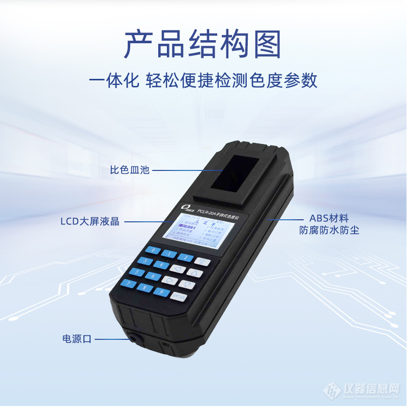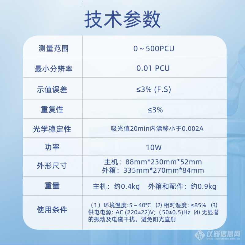用单色光透出样品,测量其吸光度,利用朗伯-比尔定律,计算出色度的大小。简单小巧、携带方便